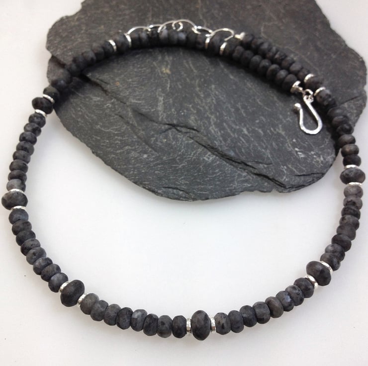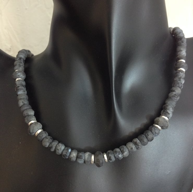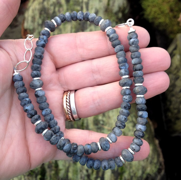 Dark labradorite roundel beads have been facet cut and given a frosted matte finish.