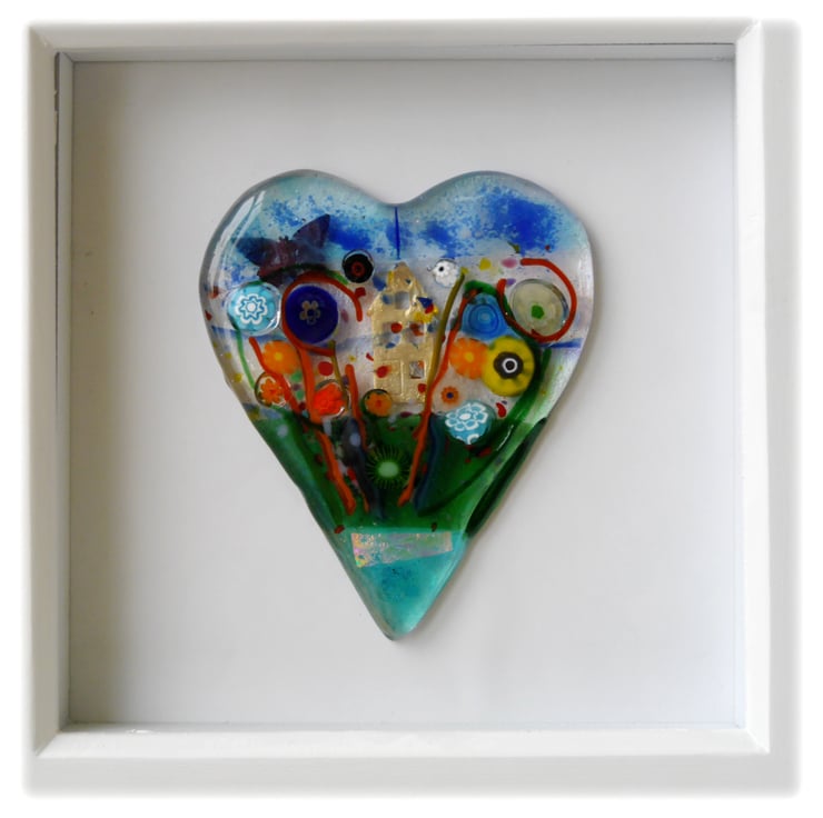 Flower Garden Heart in Box Frame Fused Glass Picture 010