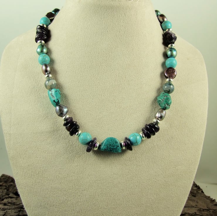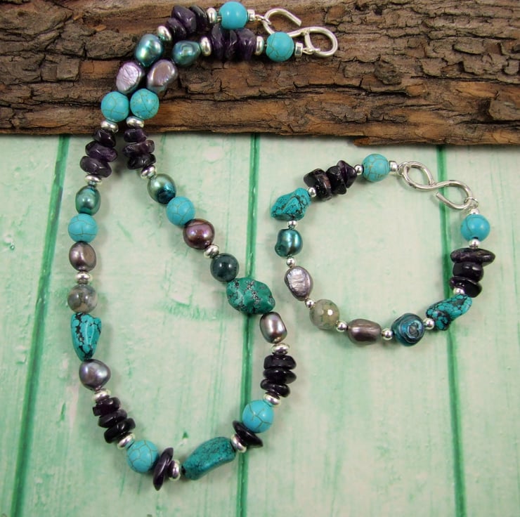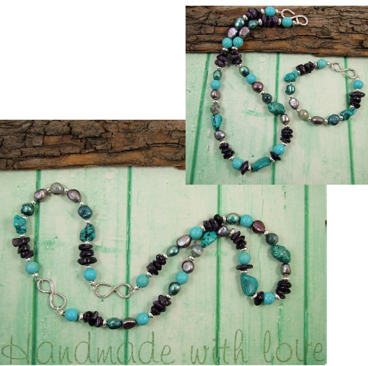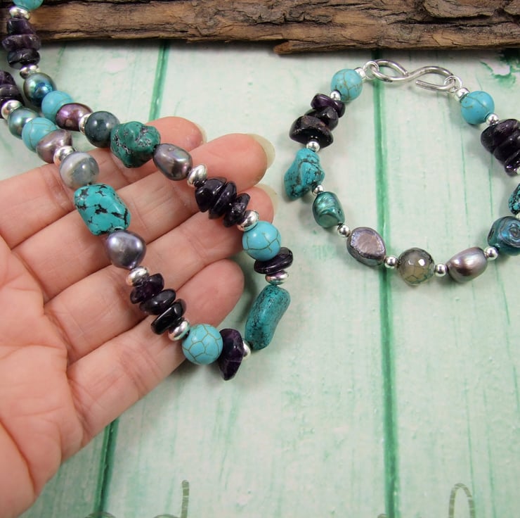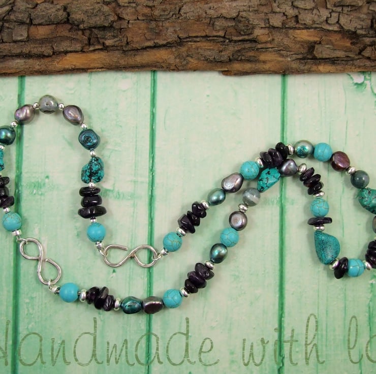 Gemstones are Amethyst, Agate, Howlite and Teal and Mocha Pearls, paired with sterllng silver beads and my own hand forged S shaped closures.