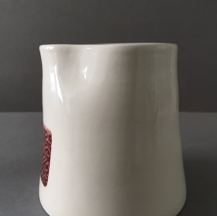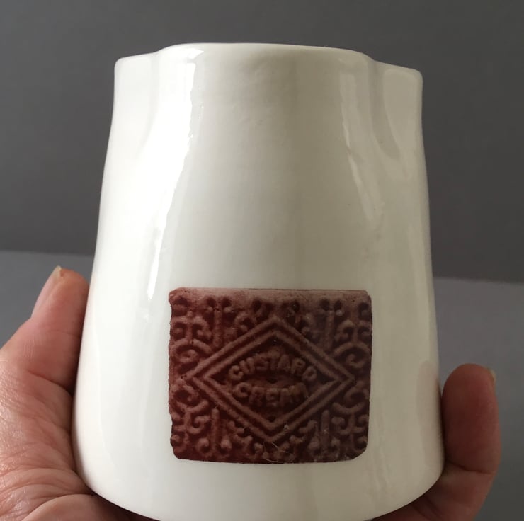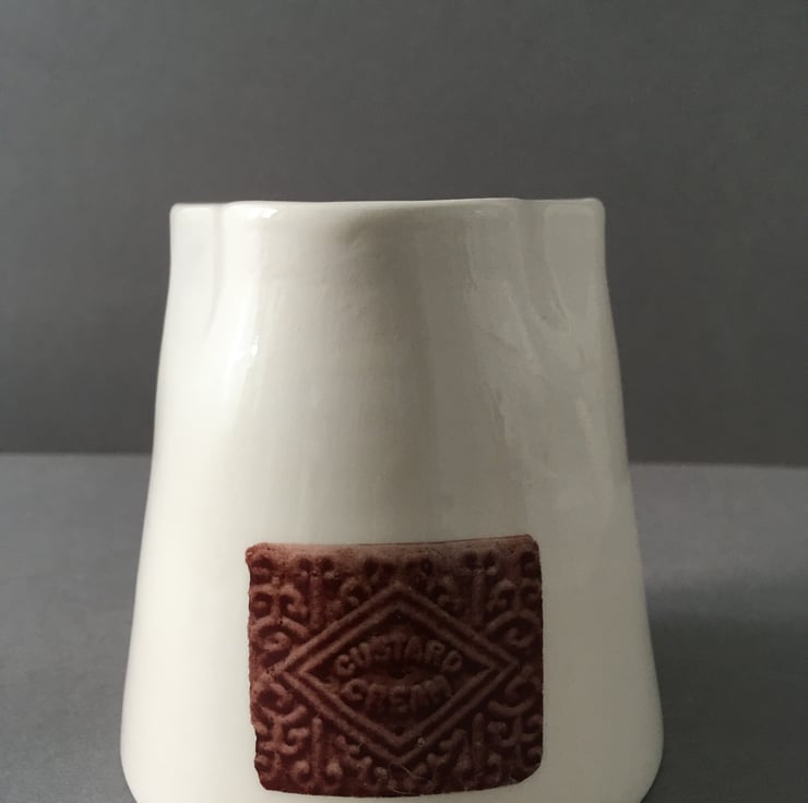 Cream/White earthenware ceramic milk jug. Handthrown on my little pottery wheel. Dipped in a transparent clear glaze. This nice size pourer has a custard cream biscuit decoration.