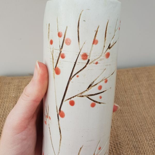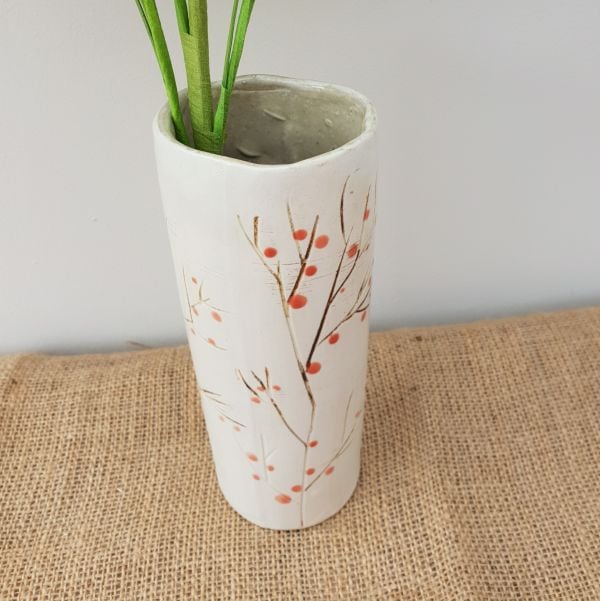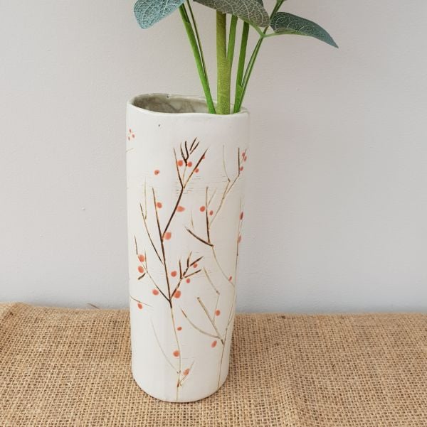 Handmade in my studio, this gorgeous cylinder shaped ceramic vase has been slip cast from one of my own handmade plaster moulds. The vase is approx 20cm tall, and includes my signature Red Berries design.