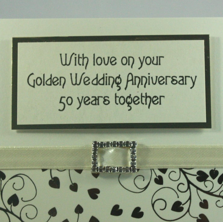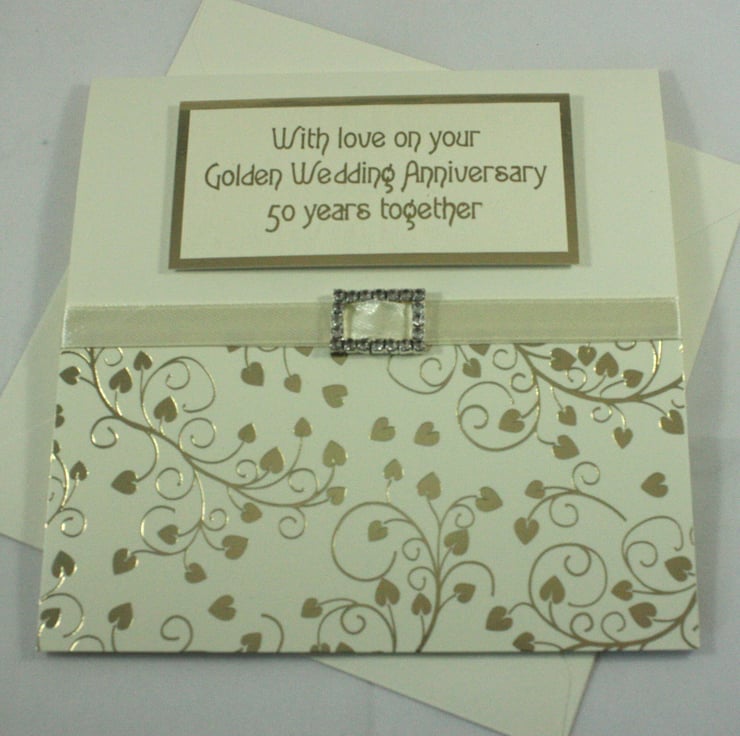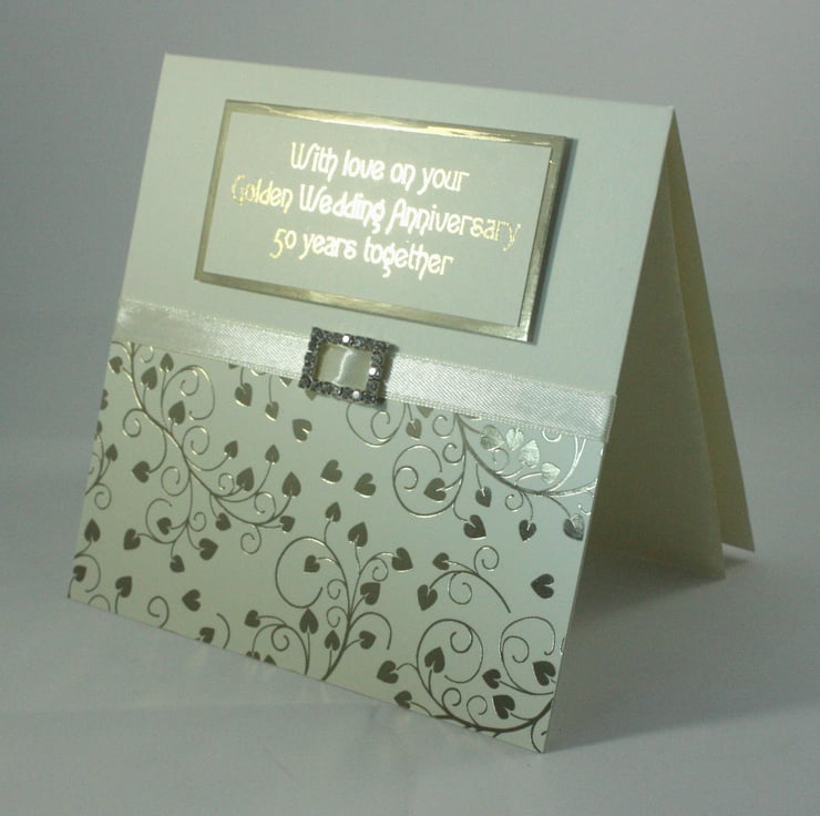 The sentiment 'With love on your Golden Wedding Anniversary 50 years together' has been printed onto cream card and finished with gold foil, over gold mirri card.