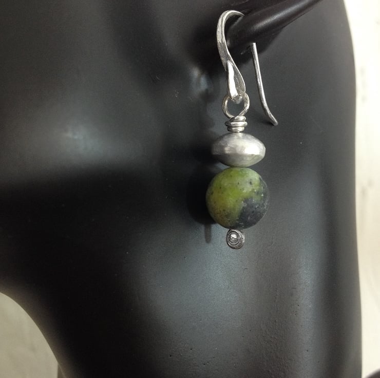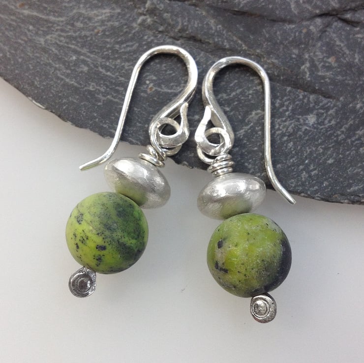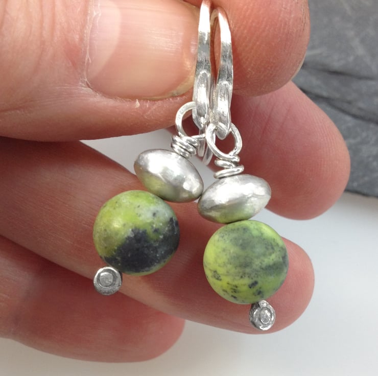 Large round chrysoprase beads in a vibrant light green and charcoal grey are topped with a hollow silver rondel beads, these are threaded on my handmade head pins, and hung from sculptural silver hooks.