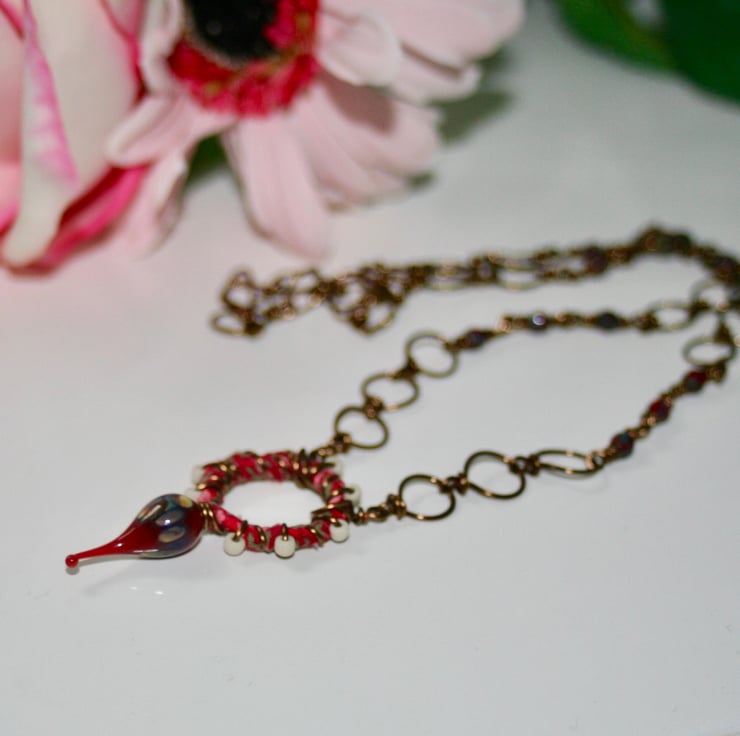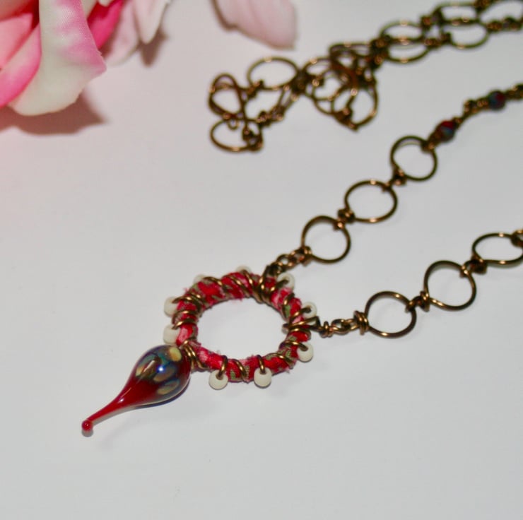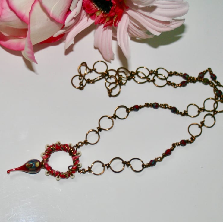 An unique necklace that features a lovely lampwork glass headpin (by Linsey Peck) hanging beneath a ring that has been wrapped in red fabric, antique bronze wire and white seed beads. The chain has been handmade from antique bronze wire shaped into rings and interspersed with faceted red picasso beads.