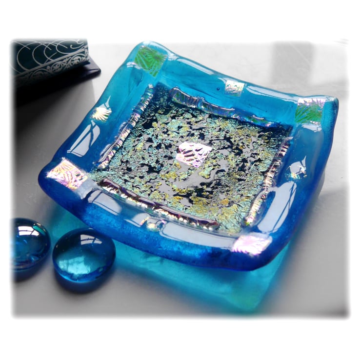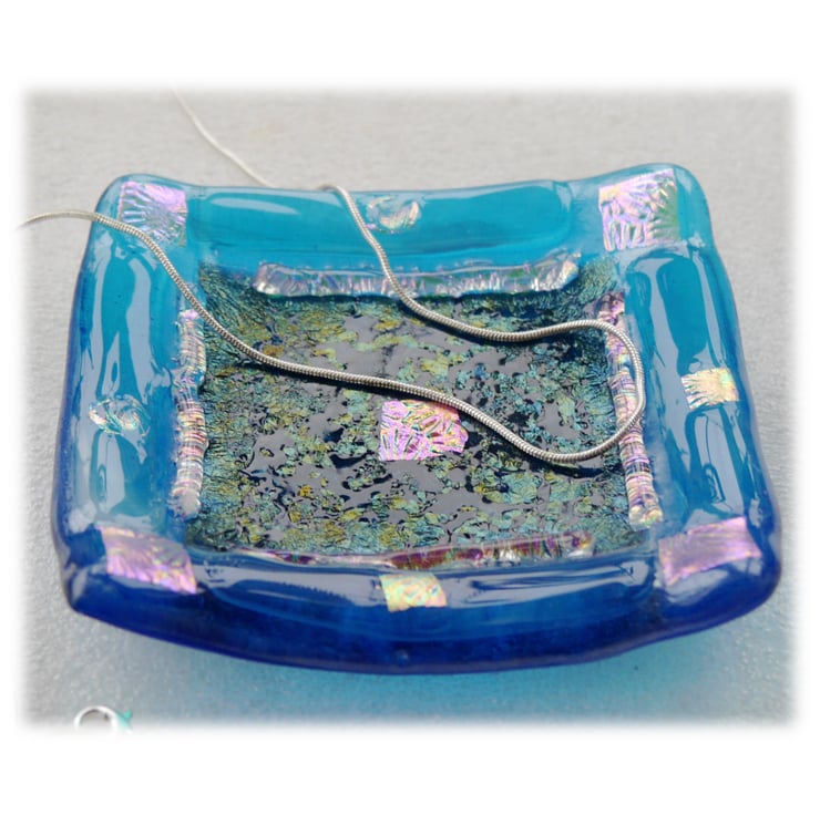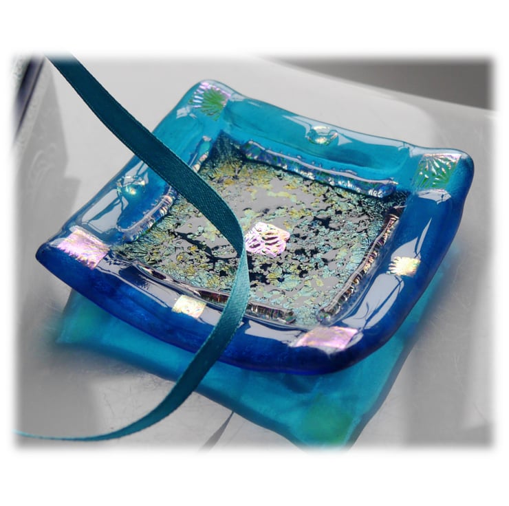I've used a clear turquoise glass for the base then added a border of deeper turquoise glass with a bright shine. The centre is a deeper teal glass which I've sprinkled with turquoise frit for interest..