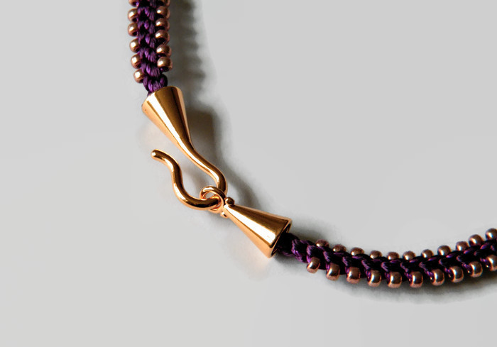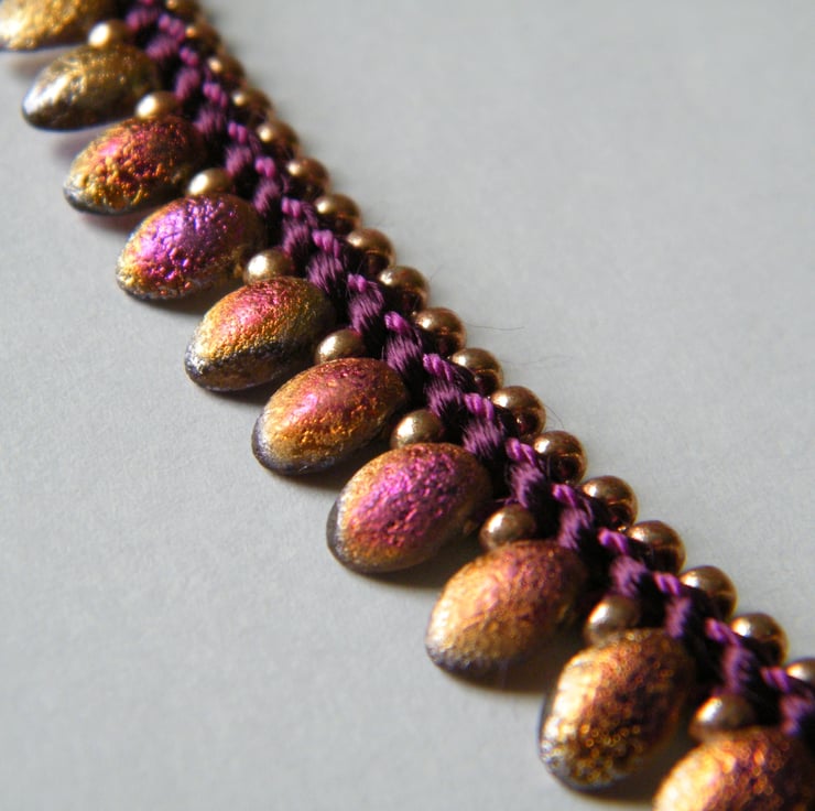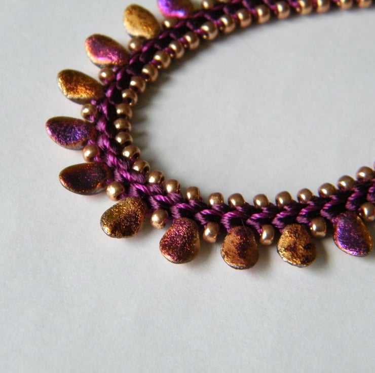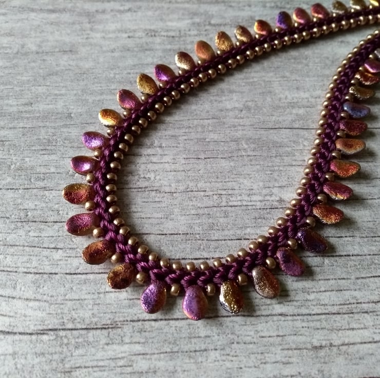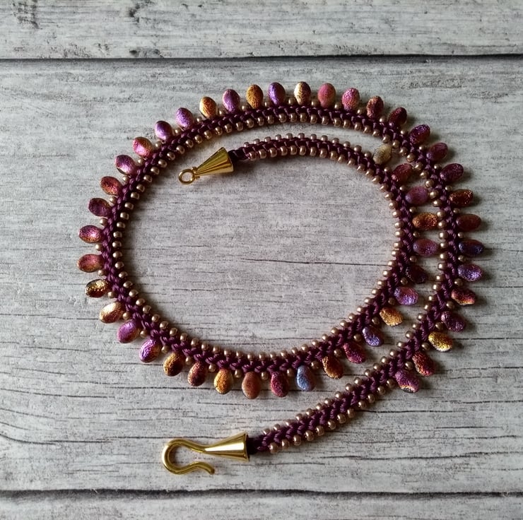 A very eye-catching kumihimo necklace braided on a plum-coloured satin cord, with tulip petal beads in an etched, slightly iridescent, purple and gold - they have a very glamorous feel and look to them, and catch the light beautifully! Everything is complemented with champagne gold Miyuki seed beads, coordinating purple beading cord and finished off with an easy-to- fasten gold-tone "hook & eye" clasp.