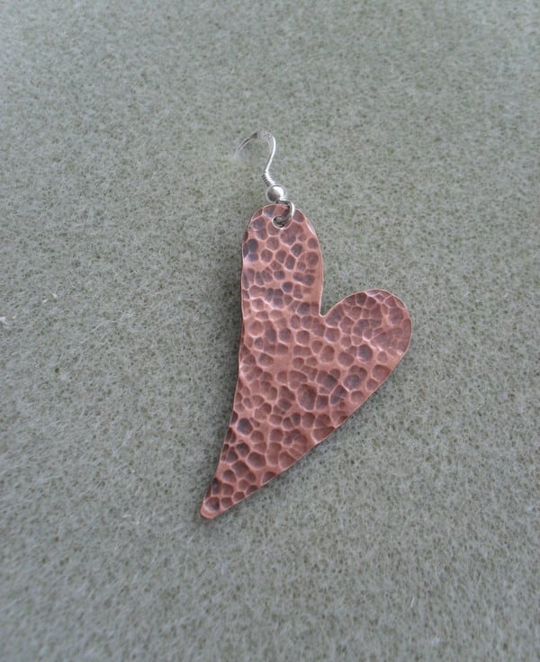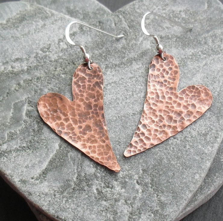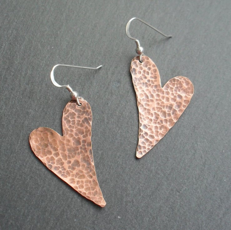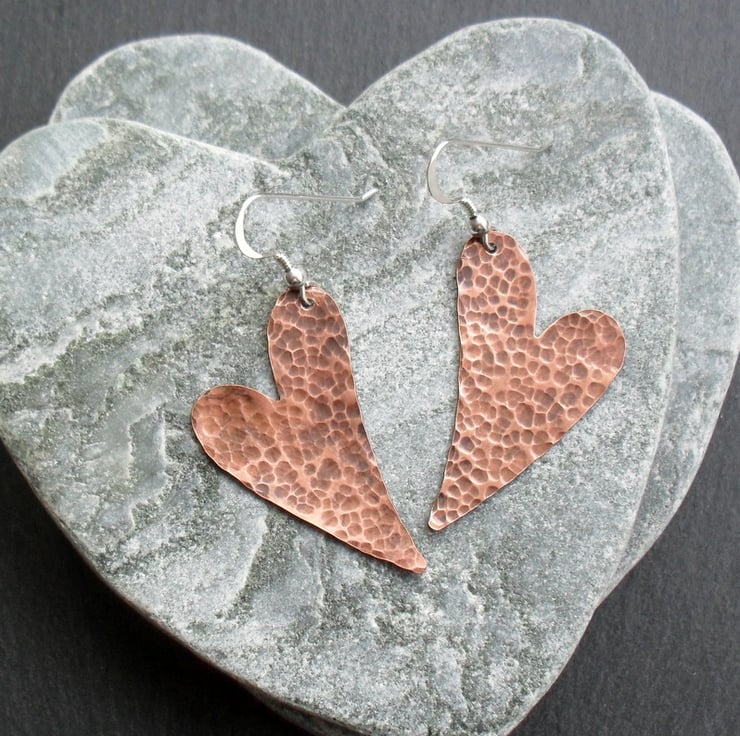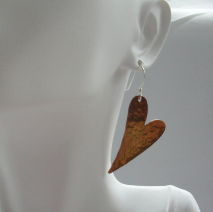 copper Heart earrings which have been textured, tumbled and oxidised are attached to sterling silver ear wires