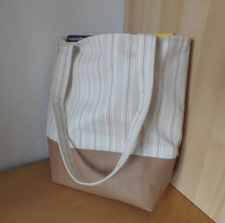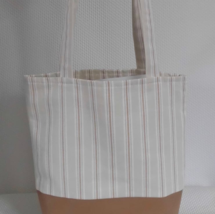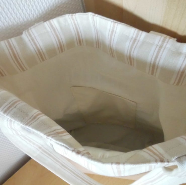 Faced at the top with the striped fabric and lined with cream cotton lining fabric. There's a slip pocket inside.