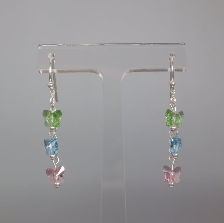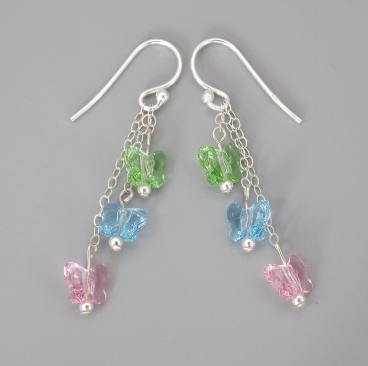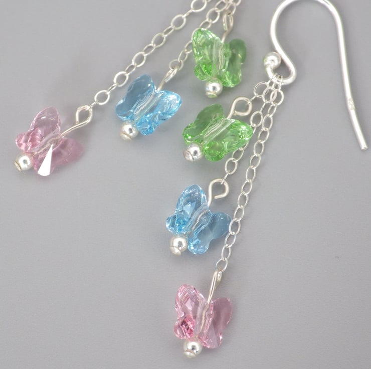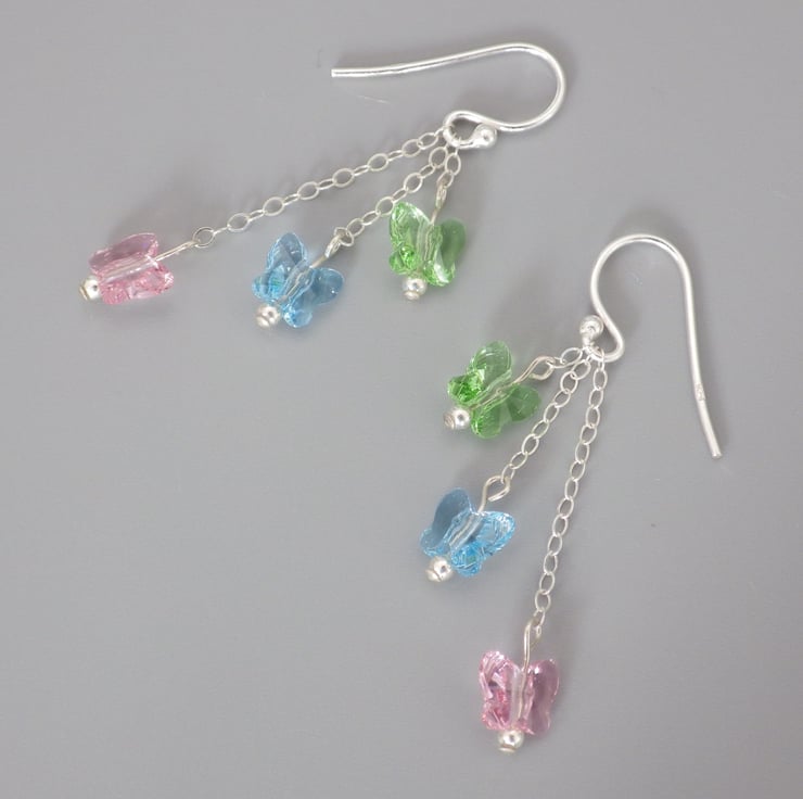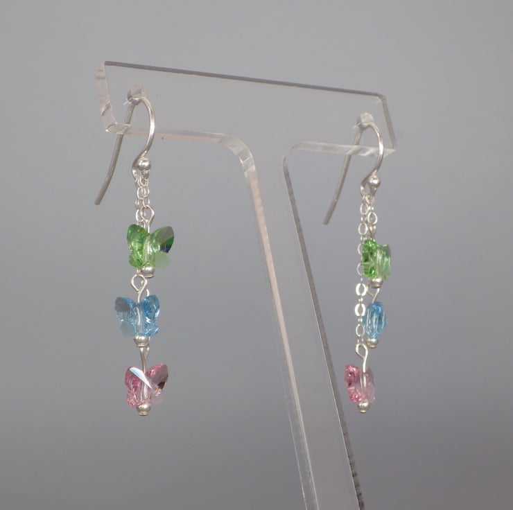 These dainty earrings are made by me using Swarovski butterfly beads, which are faceted and wonderfully sparkly. In this case, I’ve used beads in peridot green, aquamarine blue and light rose pink shades for a colourful, pretty look. The beads are hung from Sterling Silver chain and findings to form eye catching classic earrings. A versatile style, they are perfect for an evening out or to cheer up your daytime outfit!