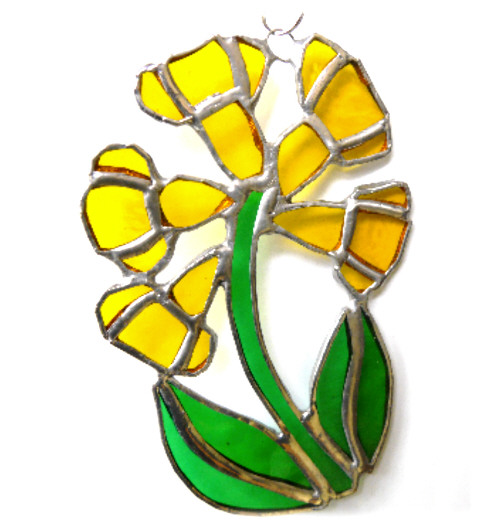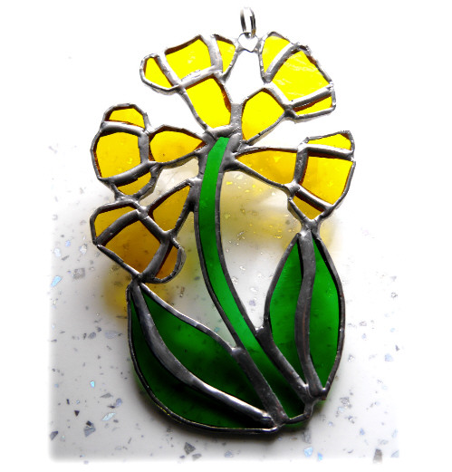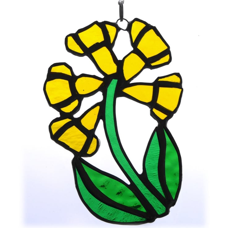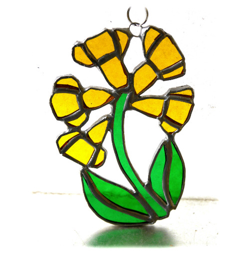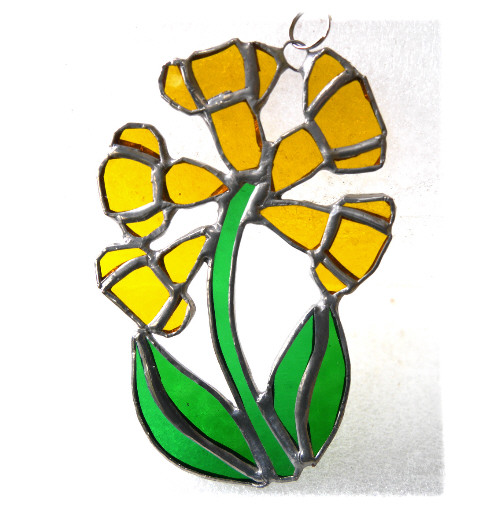 The five little yellow flower heads are each made from 4 little pieces of glass, in two shades of yellow, So the flower comprises 25 pieces of glass all individually cut, shaped, copper foiled and soldered.