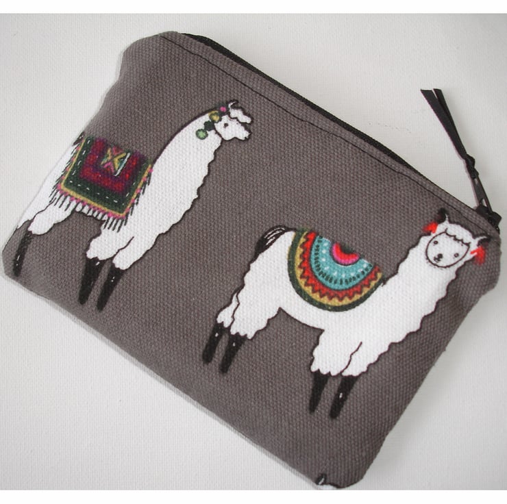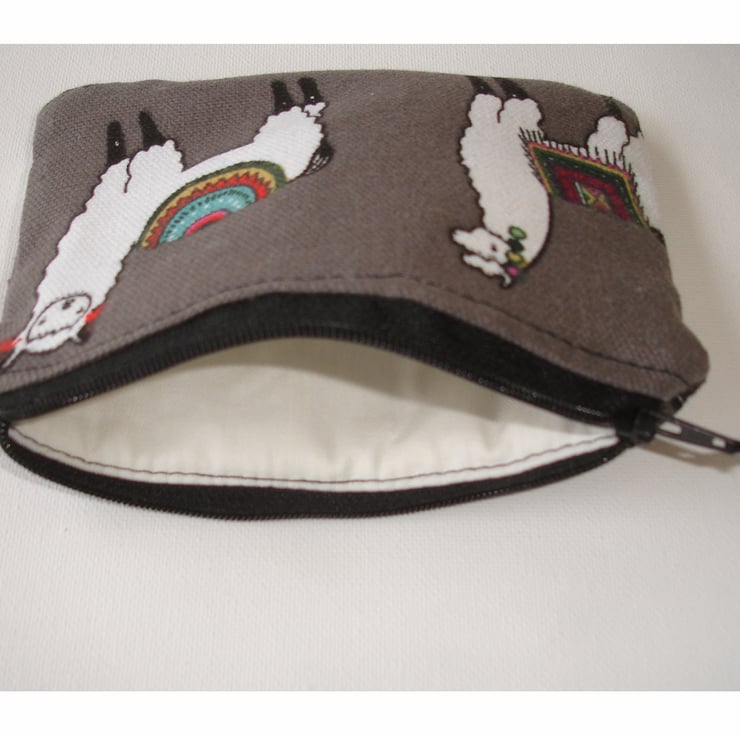 This cute little zipped purse has been made with a decorative Llama / Alpaca design fabric on a grey background.