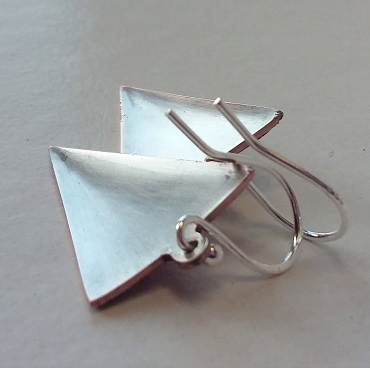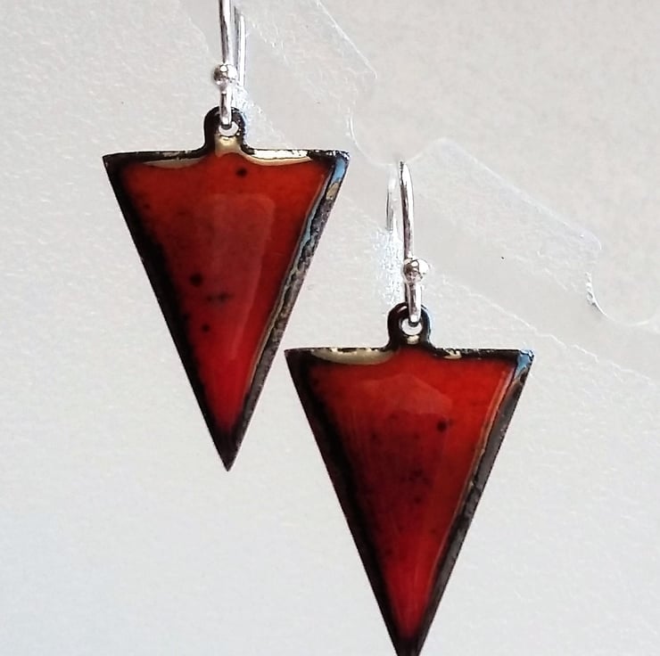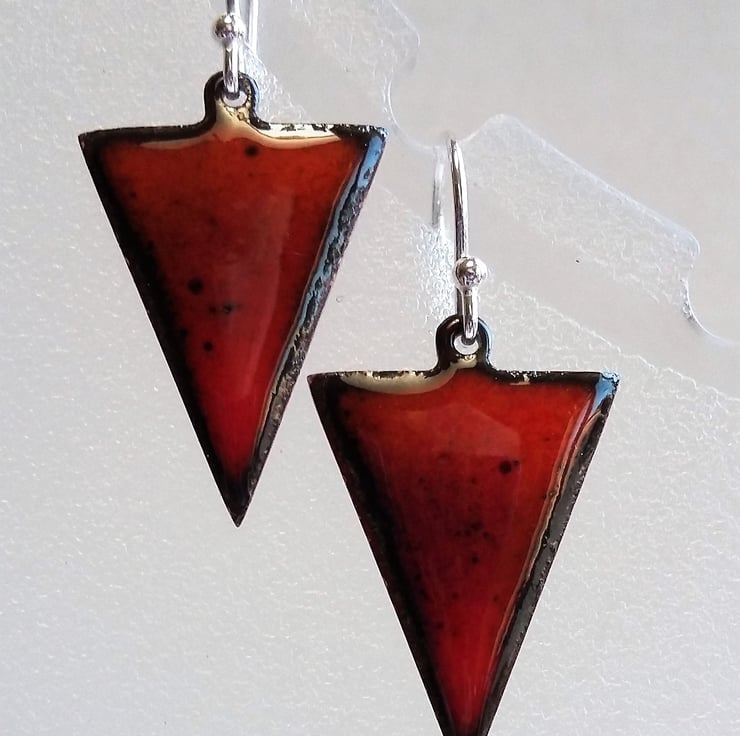 A pair of beautiful triangle copper earrings in shades of vibrant red and orange. The earrings have been kiln-fired and each measures 25mm from top to tip and 17mm across the widest part, and come complete with sterling silver earring wires. The backs have been given a light silver plating to give a polished effect. They are supplied with a little organza pouch and POSTAGE IS FREE!