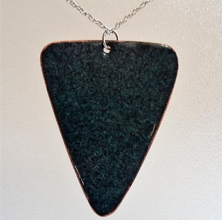 Large, hand-cut, inverted triangular pendant with rounded edges on recycled copper, enamelled with a bare branches tree on a background of grass and sky. The pendant has been kiln-fired and measures approximately 50mm from top to tip, and 40mm across the widest part. To complete the piece aesthetically and for a smooth finish against the skin, the back has been given two coats of dark blue tweed-effect enamel. It comes complete with an 18” sterling silver rope chain with a soldered sterling silver jump ring and is supplied with a little organza pouch. POSTAGE IS FREE!