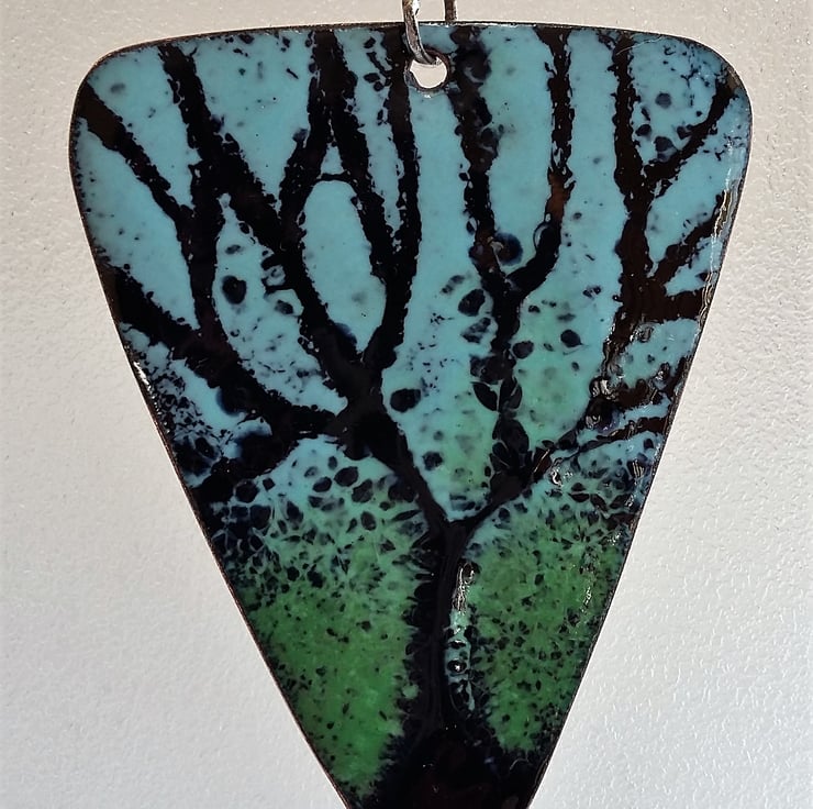 A bold and stunning piece of statement jewellery guaranteed to draw the eye, with a design which is as appealing from a distance as it is close up. The pendant has been hand-cut from a piece of recycled copper, and the edges rounded, a long and arduous process with many a snapped blade and lots of power and hand sanding! Starting with two fired layers of black enamel, I added sky blue and grass green enamel and removed some of the dry powder to leave a winter tree design before firing (a very steady hand was need both for the scraping away and to put it in the kiln!) resulting in an entirely unique piece with plenty of interest, texture and depth.