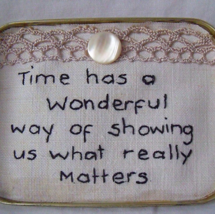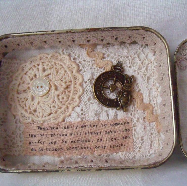 I've put a watch piece in and decorated it with vintage lace and mother of pearl buttons.