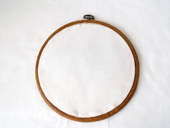 Framed in a flexi hoop wood grain mount which measures 7.5 inches across.