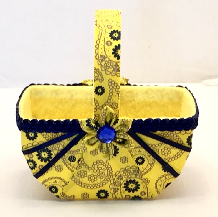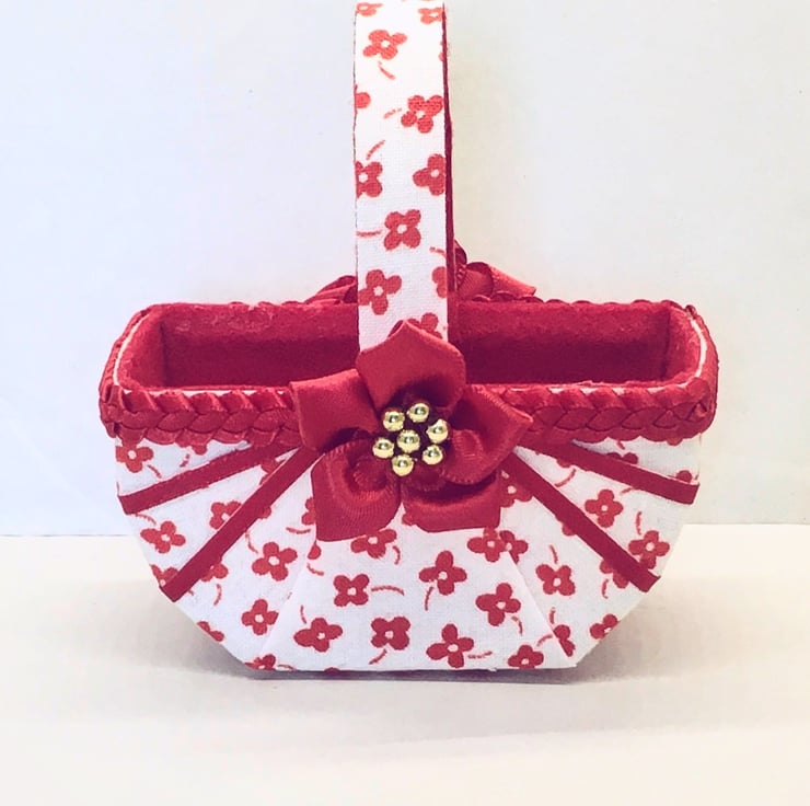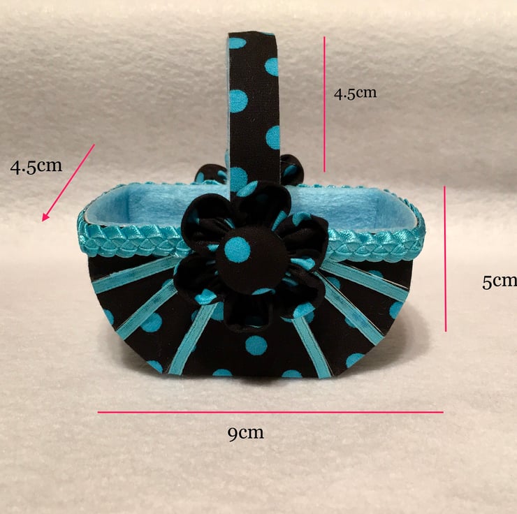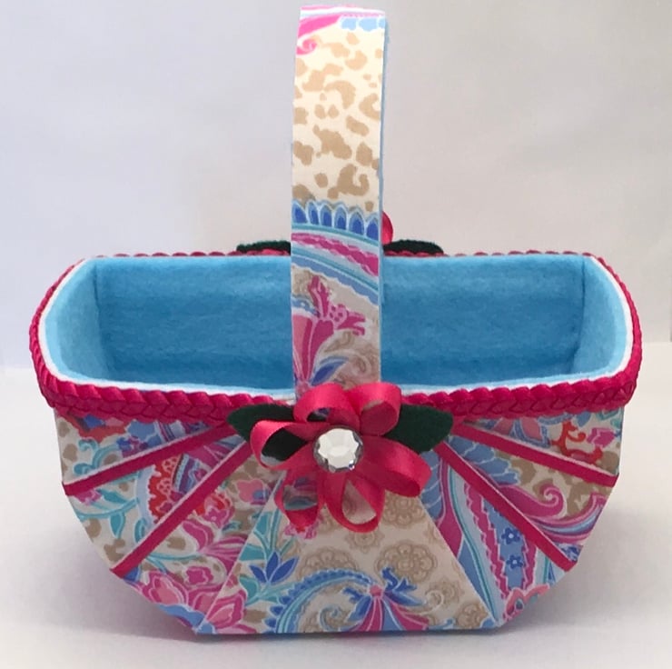 These cute fabric baskets, Gift Baskets and spring decor have lots of uses from holding your small pieces of jewellery to a selection of your favourite chocolates. They can be made in three different sizes small, medium & large. The one shown in the picture is a small. They are made from cotton fabric and strengthened by using extra heavy interfacing and florist wire. They are finished of on either side with a matching flower and braded ribbon around the edges. The inside is covered with felt in contrast with the main cotton fabric.