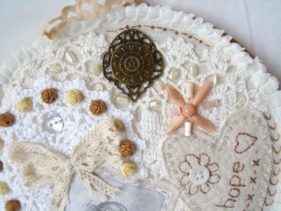 The colours are predominantly beige and cream, most of the embellishments are sewn using vintage fabric.