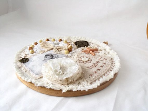 I've taken linen fabric then I've embellished it with lace, handmade flowers, linens, hand embroidery and buttons.