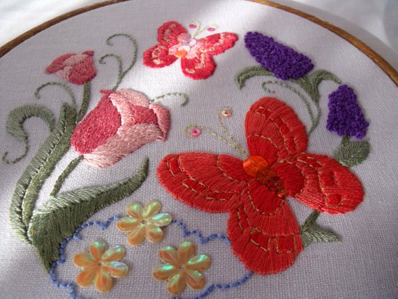 I have used a few different style embroidery stitches for this piece to achieve the desired shading and texture on the butterfly, buddleia and leaves.