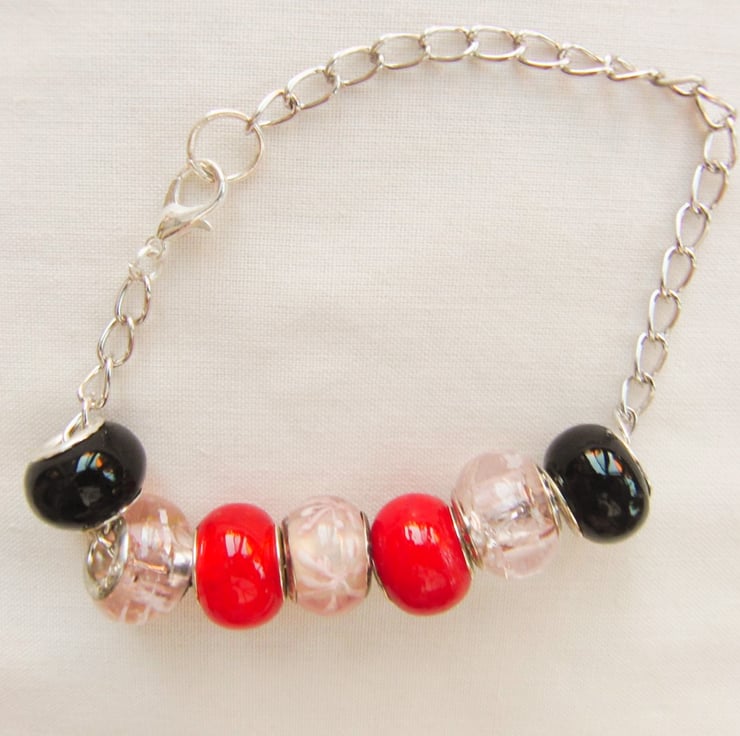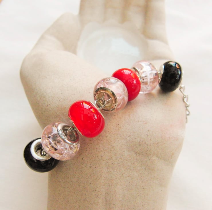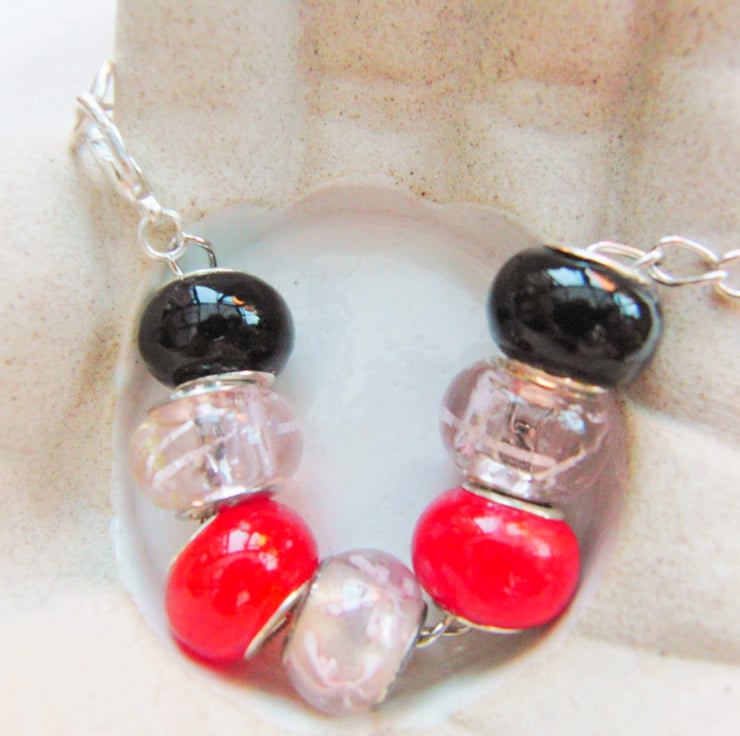 Pink Red and Black European Lampwork Bead Bracelet on a Silver Plated Chain, Jewellery, Accessories, Gift, Birthday, Christmas, Anniversary