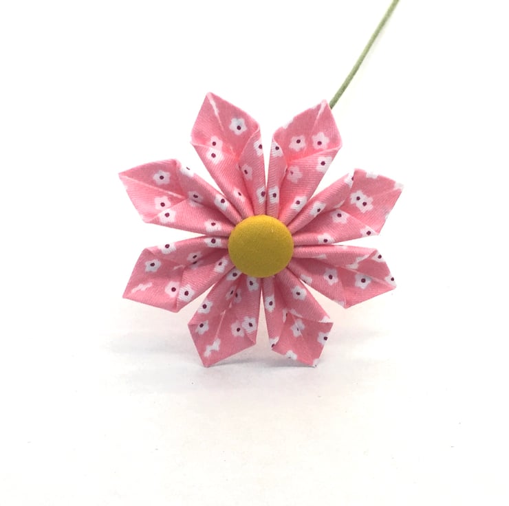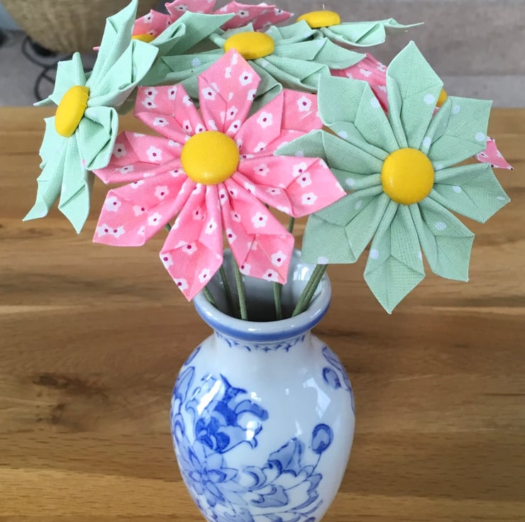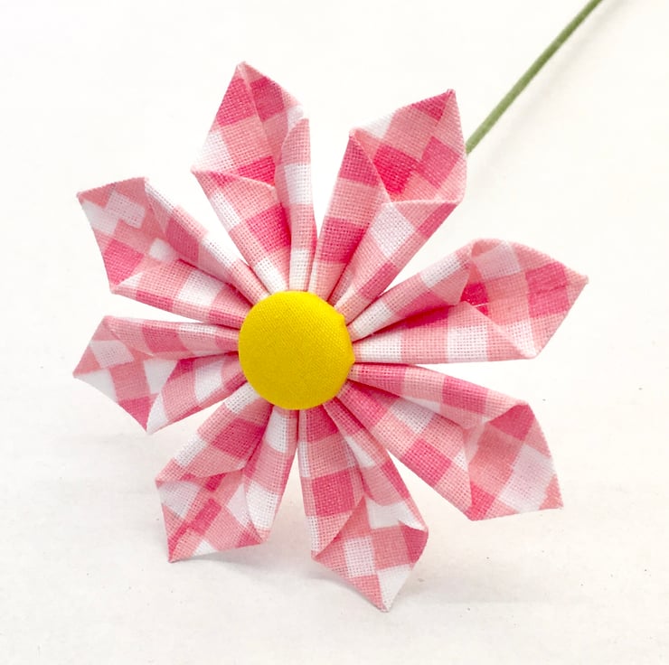 A selection of lovely Fabric Flowers made from Cotton Fabric in three different fabric designs. The Fabric designs consist of Pink/White checked, Green/White Checked, Pale Pink Floral and Pale Green/White Spotted Fabric. These are attached to Green Florist wires, with a cover button in the centre finished in a yellow felt.