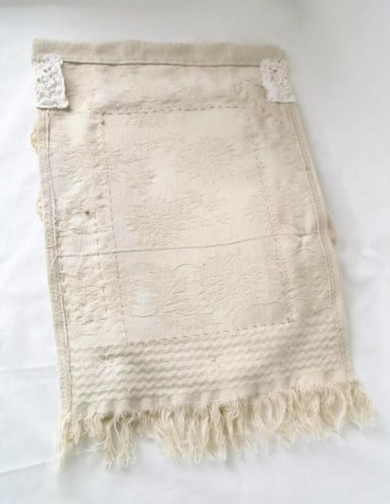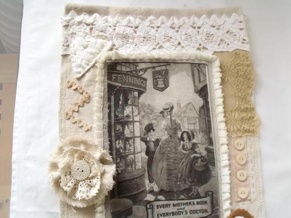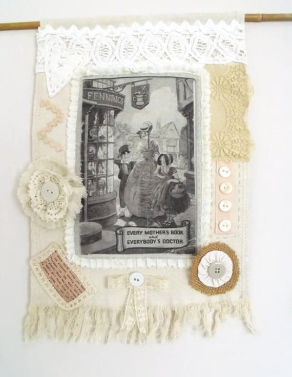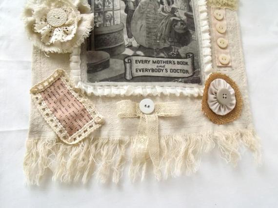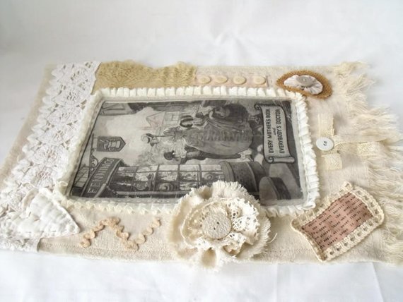 I've taken a vintage book and transferred the cover onto fabric, this was the starting point for this piece. then I've embellished the vintage tray cloth with lace, handmade flowers, linens and buttons.