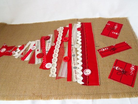 I've added various pieces of ribbon and lace in cream and red, then glued coordinating buttons to the piece.