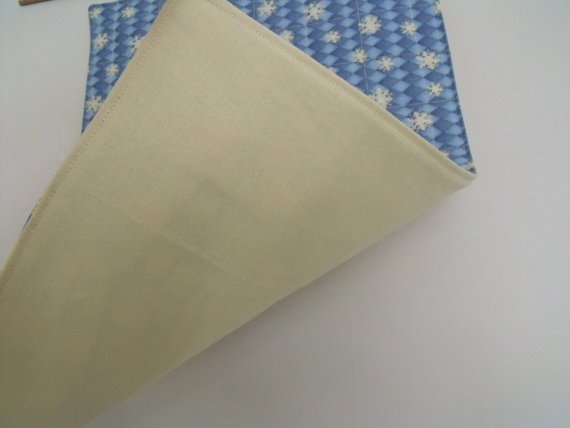 I've used blue and cream snowflake cotton fabric and quilted it onto Hobbs cotton wadding.