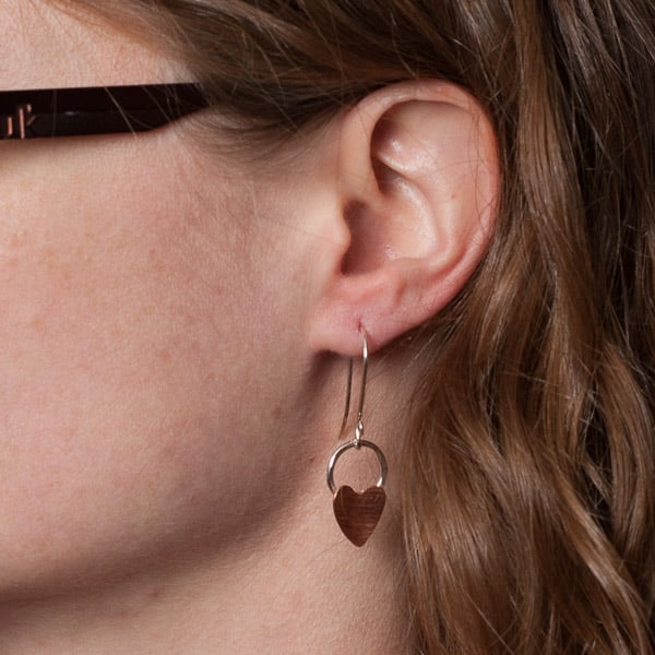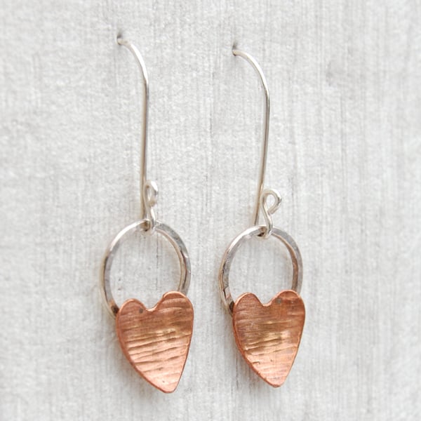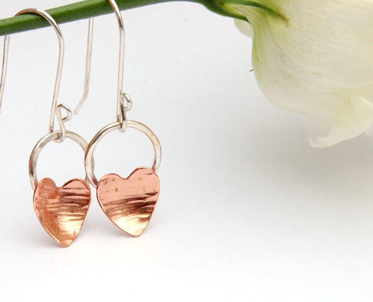 Contemporary and romantic copper textured hearts hanging from a sterling silver hammer textured circle, delicately dangling beneath a handmade sterling silver earring hook.