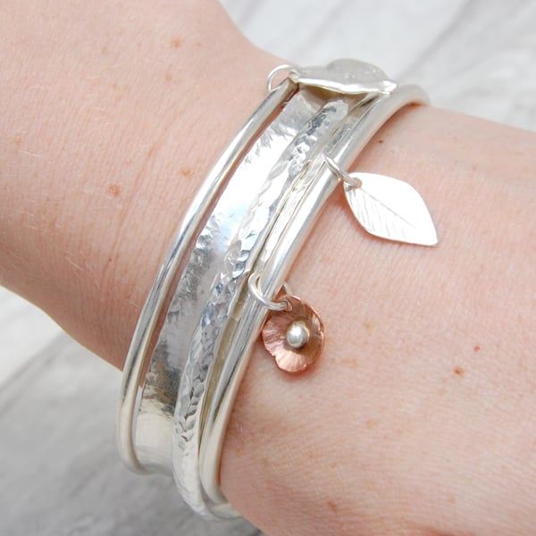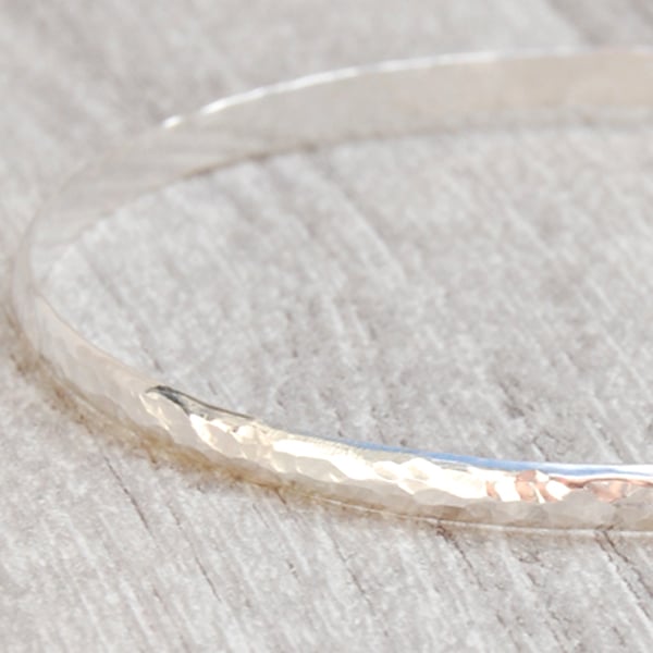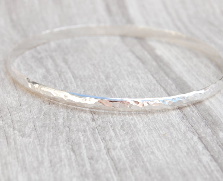 Each of these sterling silver bangles begins as a length of D shaped wire on my bench which I then have great fun in cutting, shaping, soldering, pickling, filing, sanding, hammering, tumbling and polishing to create these distinctive bangles, before sending them off to Birmingham Assay Office to get each one hallmarked.