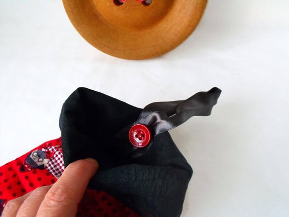 Dark grey satin ribbon hanger and red button.
