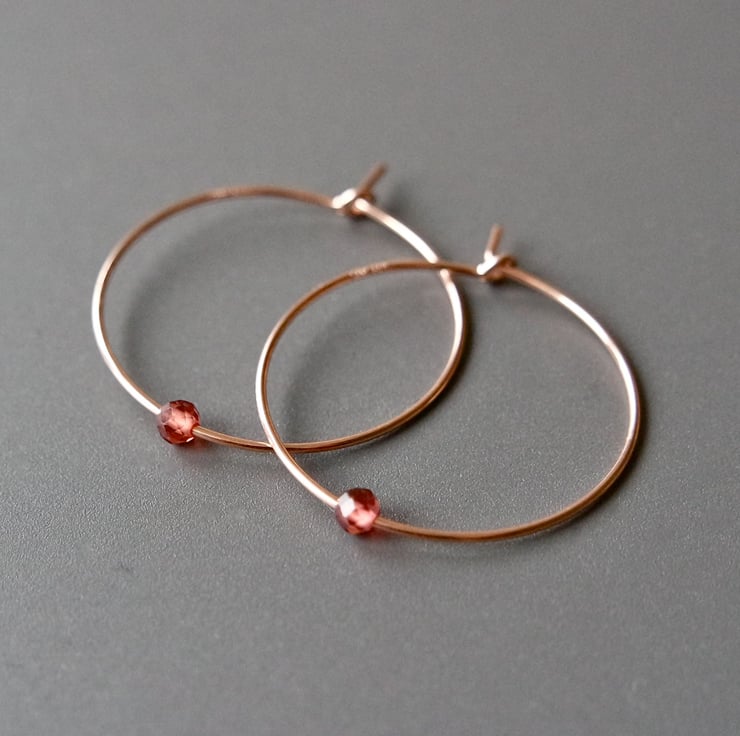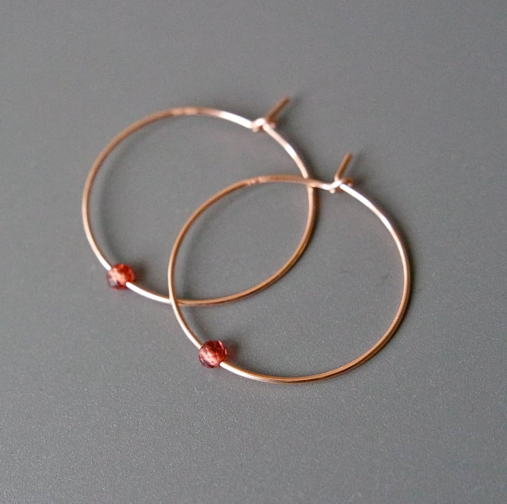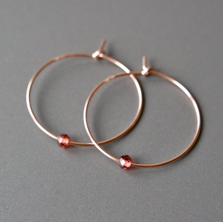 A pair of 14k rose gold filled hoops with beautifully sparkly, faceted Garnet gemstone beads