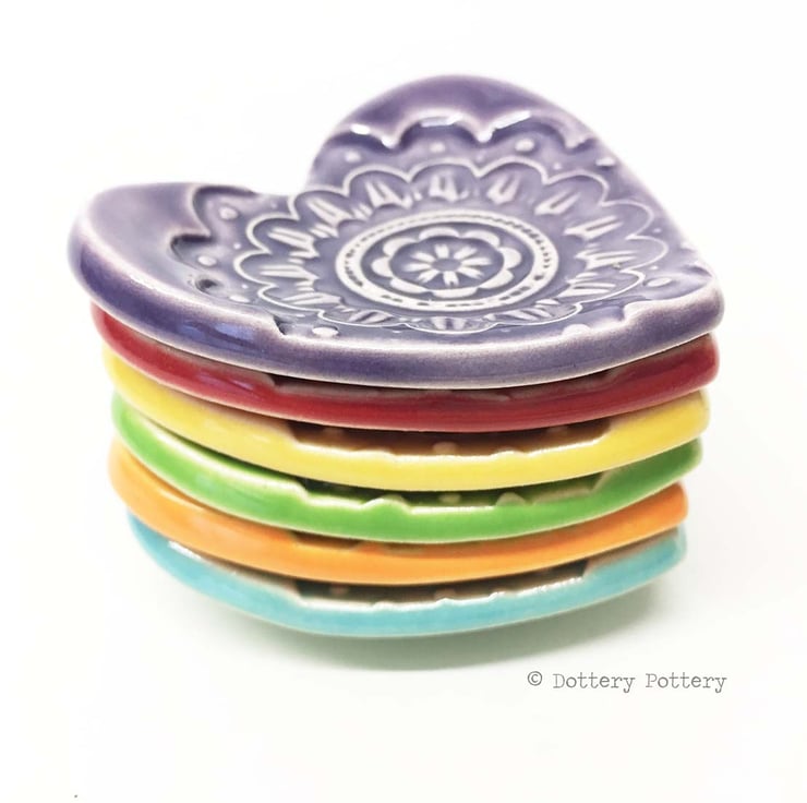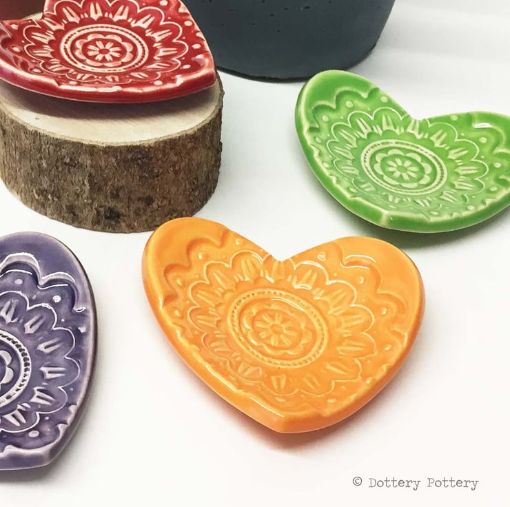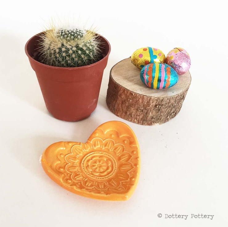 This is for one ORANGE heart dish. This teeny, little heart dish, is glazed in a bright, glossy glaze. It is made from white earthenware clay and fired to a top temperature of 1100 degrees, so it is nice and strong. Dish measures 5cm x 5.5cm x 1cm deep. Finished in a food safe glaze. Perfect as a trinket or ring dish.