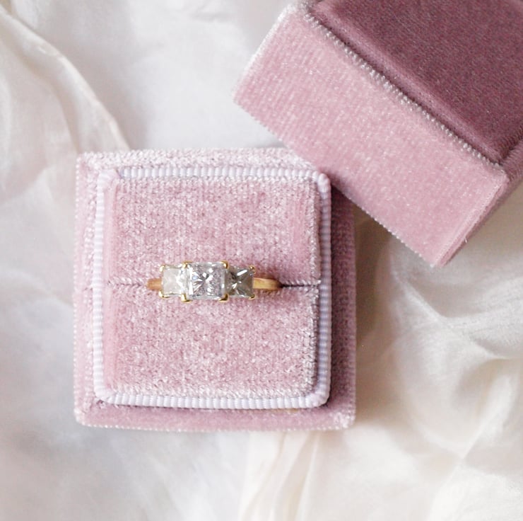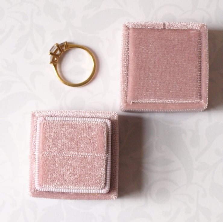 Beautiful blush pink velvet ring box wrapped in soft velvet. This elegant box has a removable lid and and is lined with white satin.
