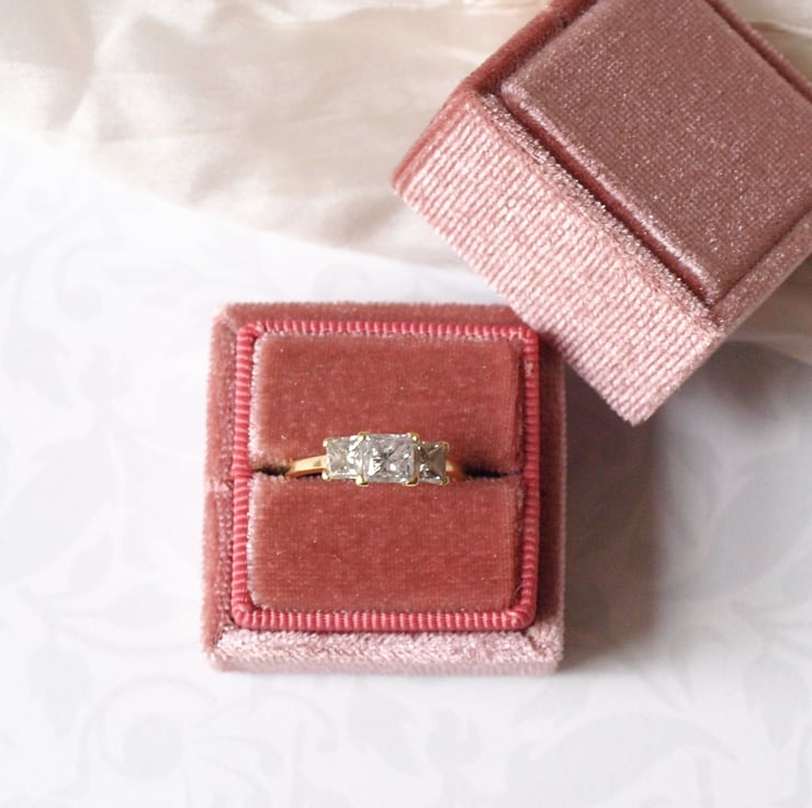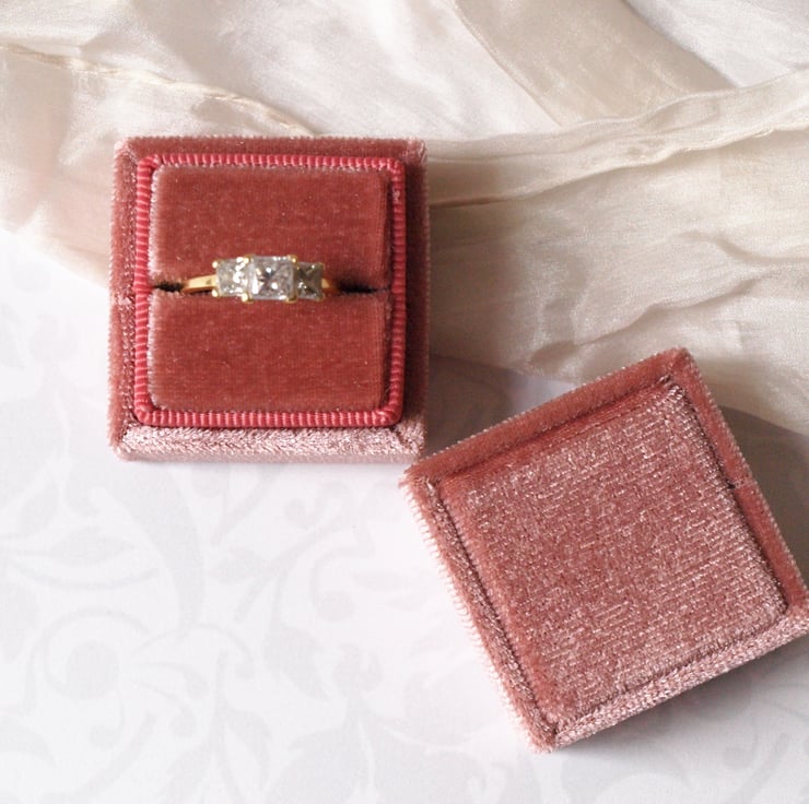 Beautiful rose pink velvet ring box wrapped in soft velvet. This elegant box has a removable lid and and is lined with white satin.
