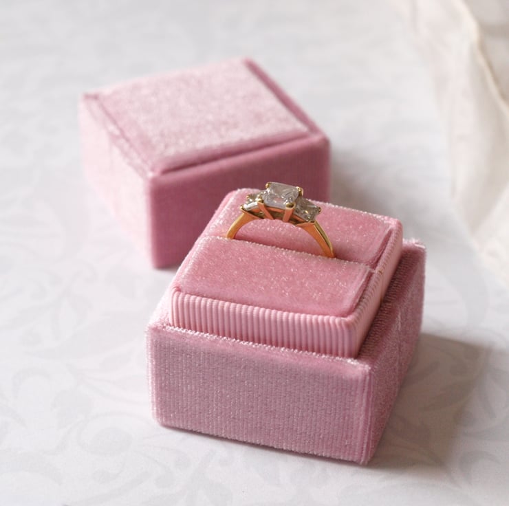 Beautiful rose pink velvet ring box wrapped in soft velvet. This elegant box has a removable lid and and is lined with white satin.