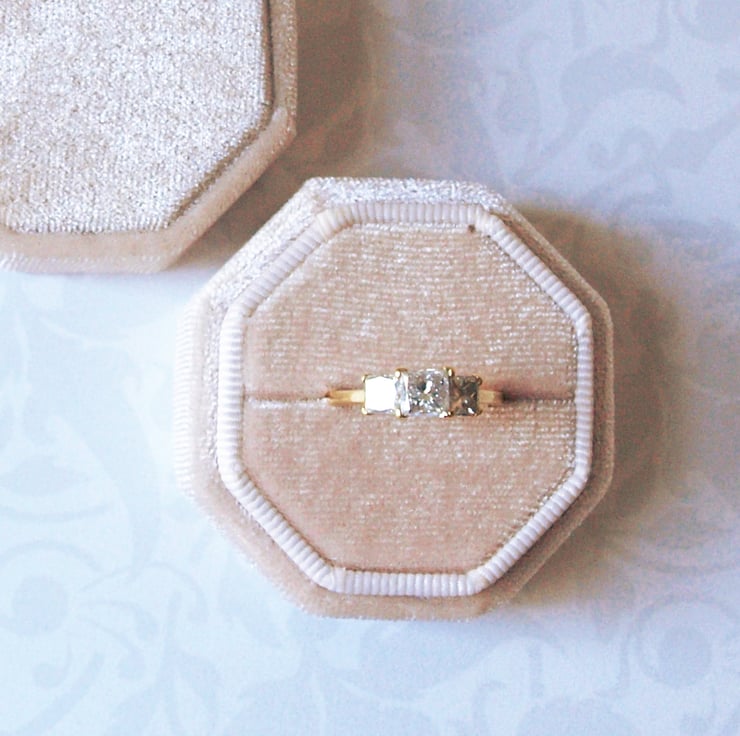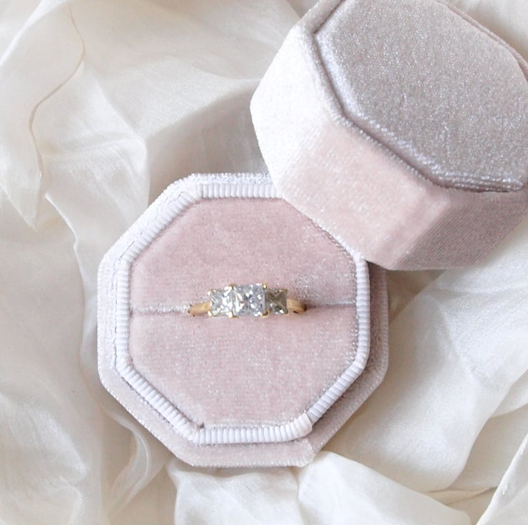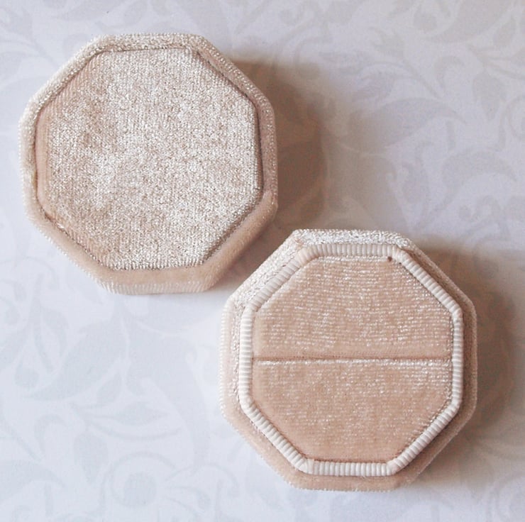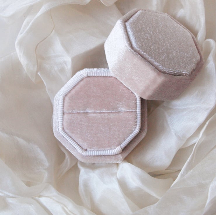 Beautiful and luxurious pale pink velvet ring box in an octagonal shape and wrapped in soft velvet. This elegant box has a removable lid and and is lined with white satin. A special box for a special ring, perfect for an engagement ring or to hold a wedding ring for a ring bearer.