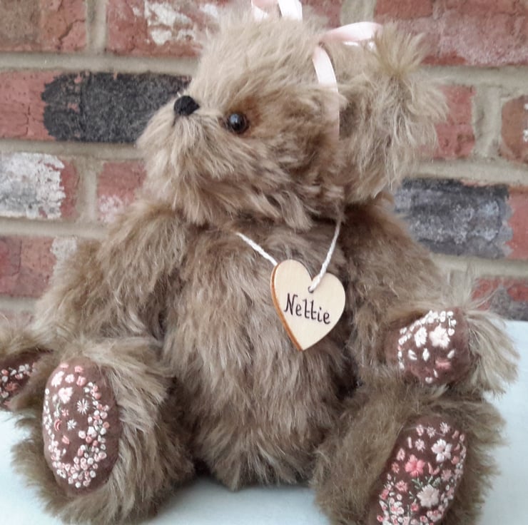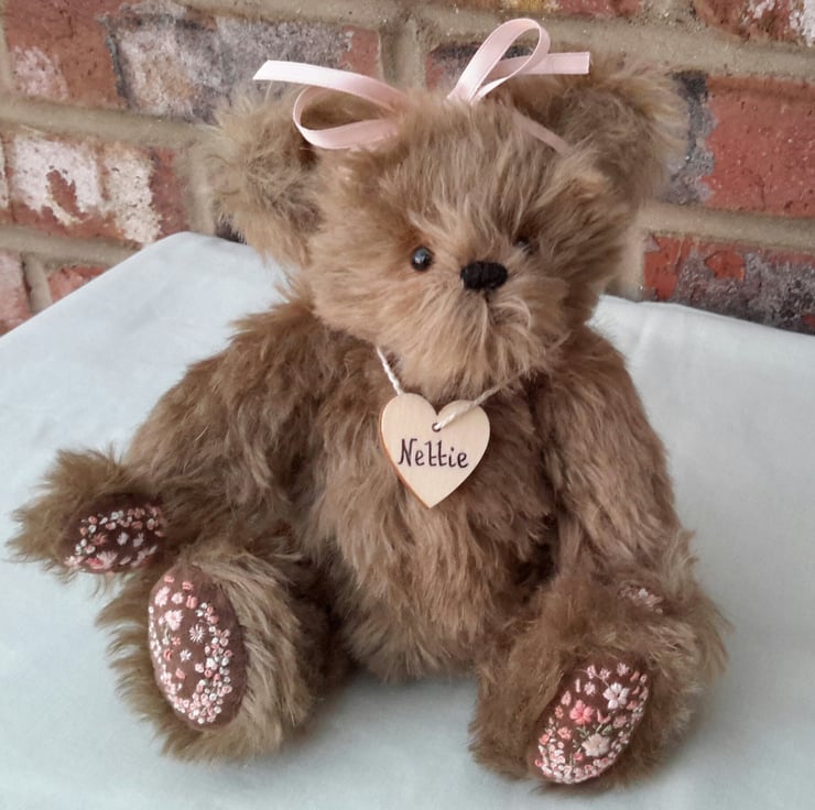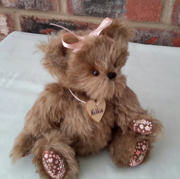 Nettie is 9" tall and hand made from luxury 20mm whirl mohair in Brown mouse.