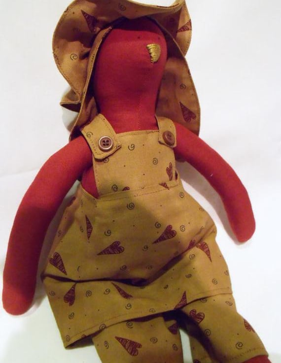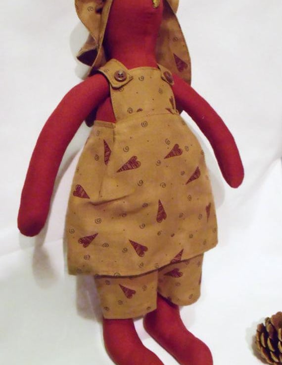 This Tilda bunny has an unusual rust red body, she is wearing a primitive style tan coloured pinafore and trousers adorned with hearts.