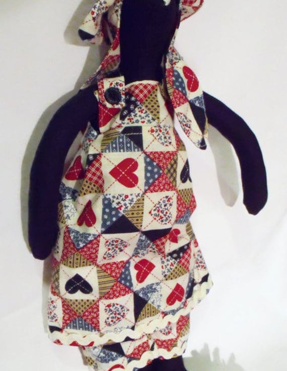 This Tilda bunny has a navy blue body, she is wearing a faux patchwork pinafore dress and trousers.