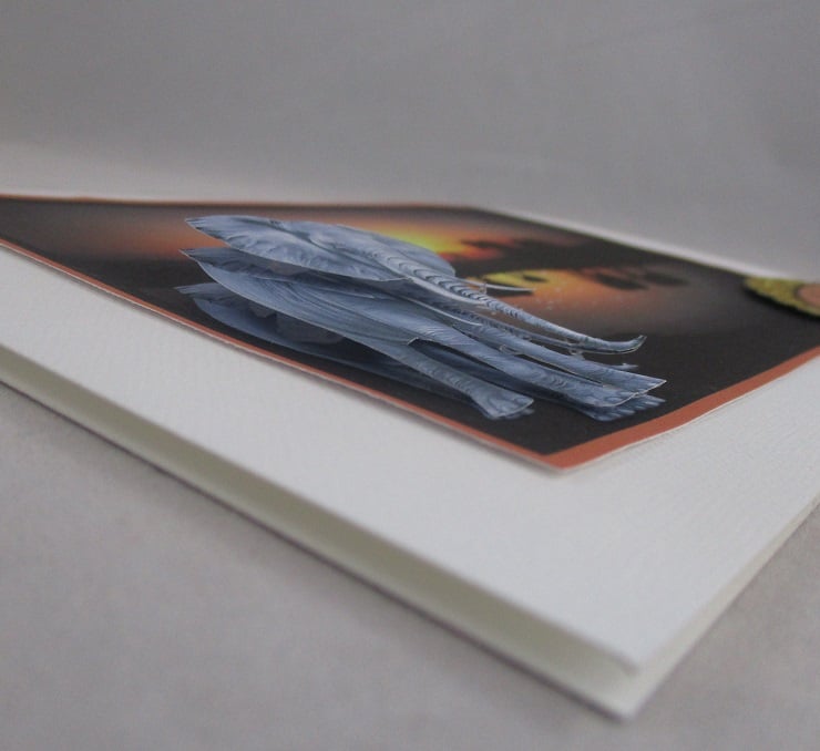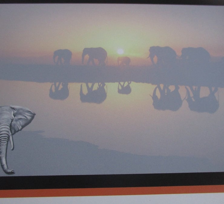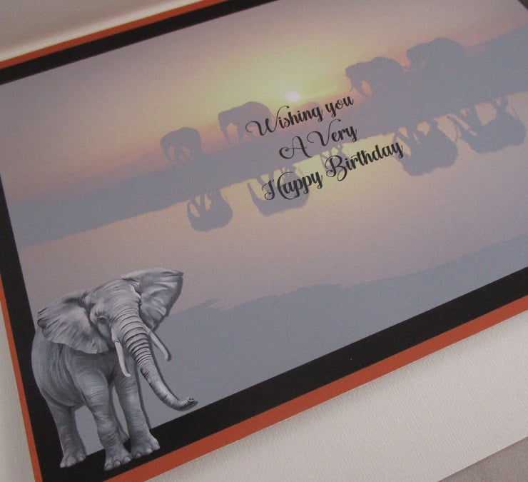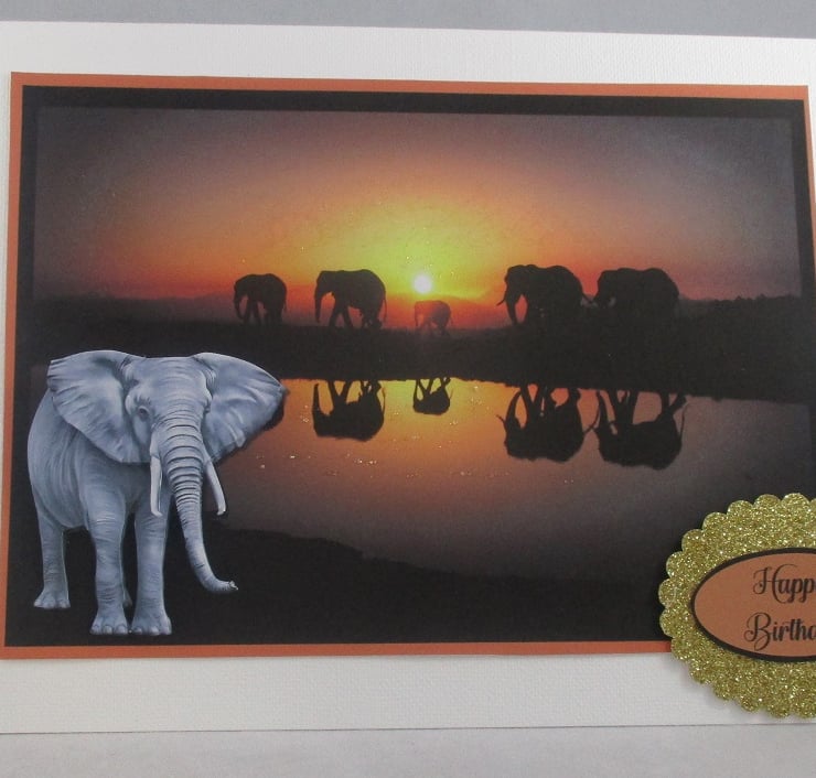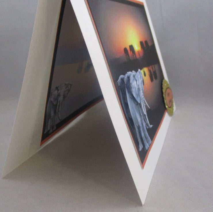 A landscape white card measuring approximately 210x150mm (8x6in) has a decoupage/3D effect picture of elephants against a lovely background of the sun setting.