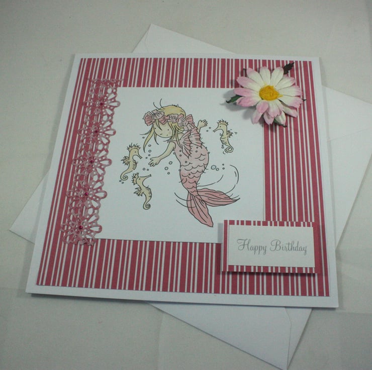 Square birthday card, suitable for children or adults, featuring a hand coloured image of a mermaid swimming with seahorses.