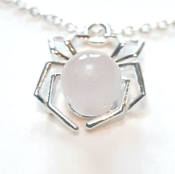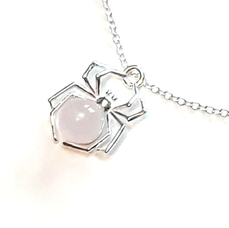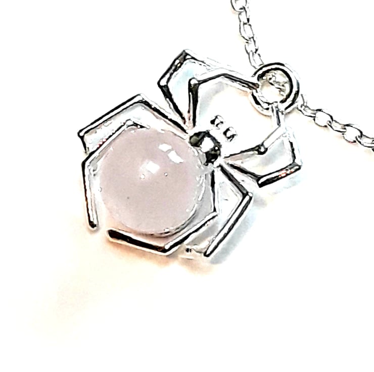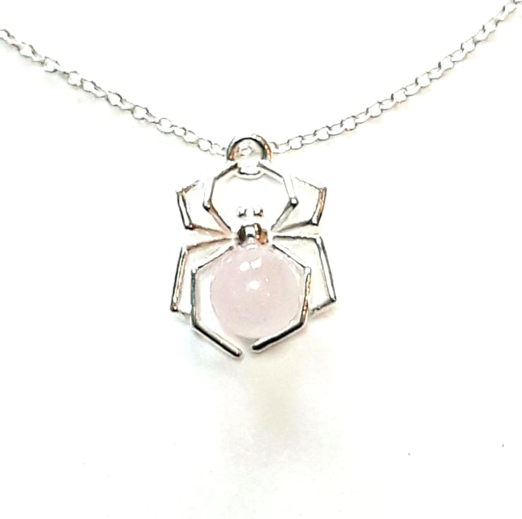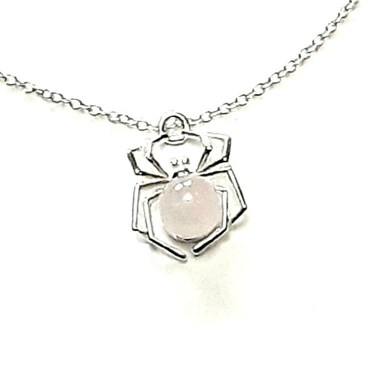 This spider pendant is all 925 sterling silver including the chain, with a round pale pink Rose Quartz stone in its centre.