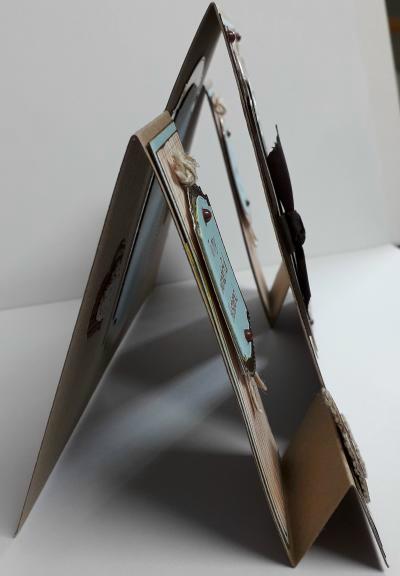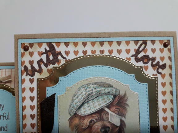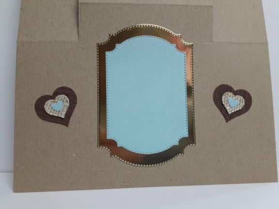 The picture has been matted onto blue textured card then gold mirri card with dark brown ribbon around it, this is on a background of small brown hearts, then blue card and a base of kraft card. The panels on either side have "To my wonderful husband" and "On valentine's day" on them. I have added die cut hearts and "with love" die cuts at the top of the centre panel. Inside is a plain blue panel for you to write your message, with hearts to the sides, the white envelope has a re-enforced card front.