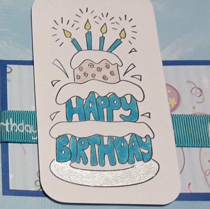 The card is decorated with blue and balloon papers and features a stamped and coloured image of a birthday cake with candles and the sentiment “Happy Birthday”