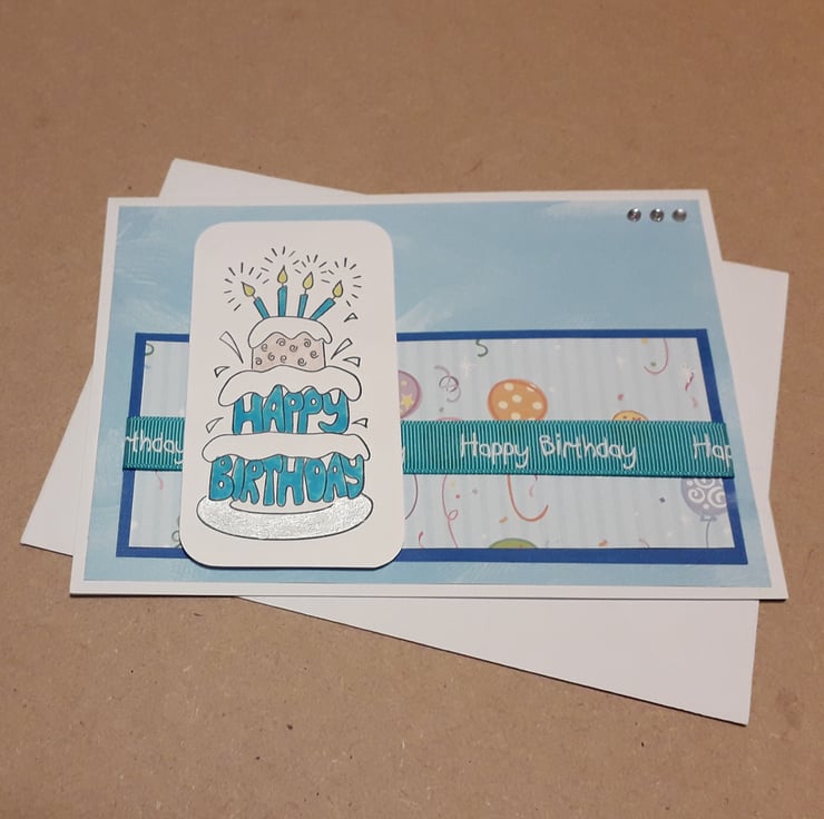 The card is completed with blue Happy Birthday ribbon and three gemstones to the top right hand corner.