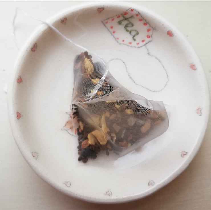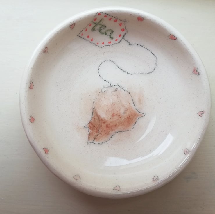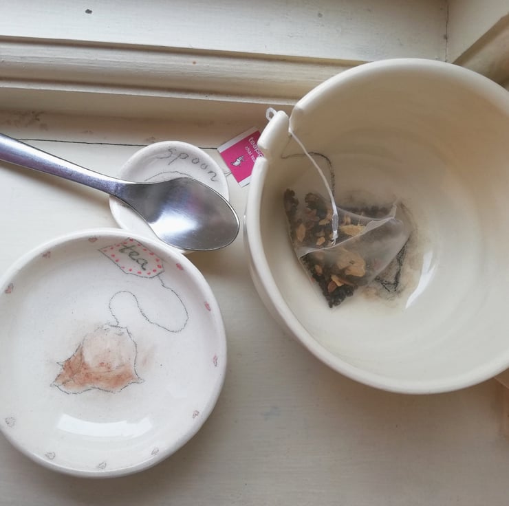 Hand thrown pottery tea bag rest for used bag and teaspoon in white clay with handpainted teabag and shiny glaze .