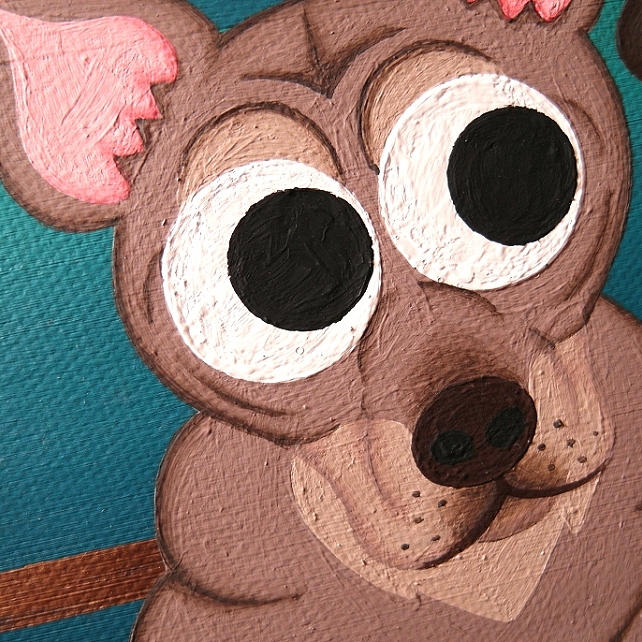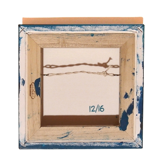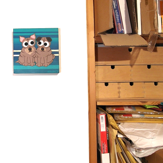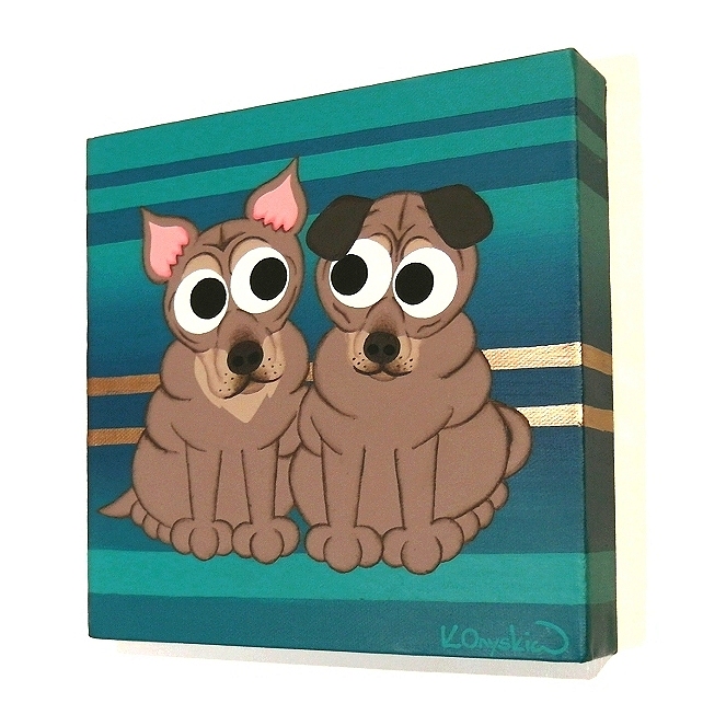 This cartoon dog art is painted in acrylics (with enamel for the gold), on a 20cm square canvas with 3.8cm deep edges (7.9" square with 1.5" edges) The stripes carry on over the edges of the canvas so there is no need for framing