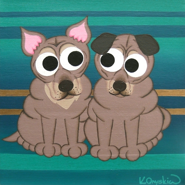Dogs in Love Painting on Teal Green Striped Canvas - cute Shar Pei dog art